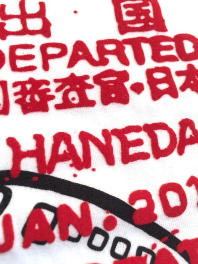 赤色の出国スタンプはフロッキー(起毛された生地)プリントです。
