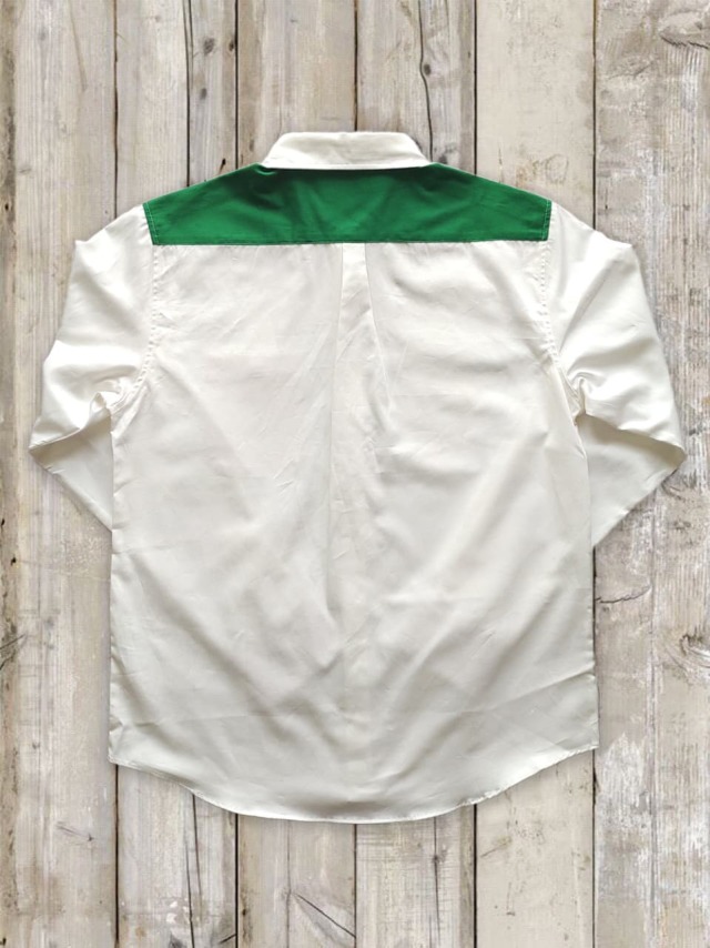 肩まわりに緑、胸ポケットにオレンジ、袖口に赤、がアクセントになって、個性的な仕上がりに。