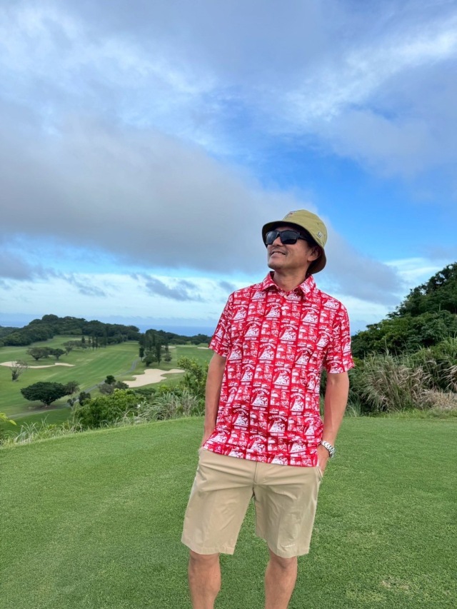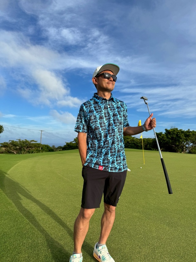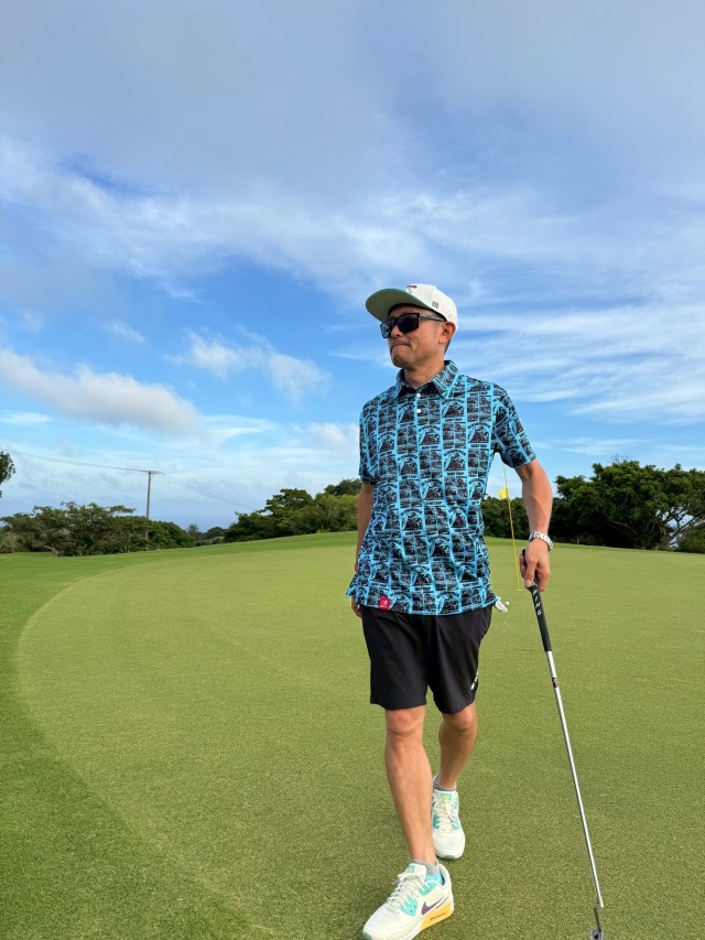 ポロシャツなのに、アロハシャツみたいなリゾート感。
