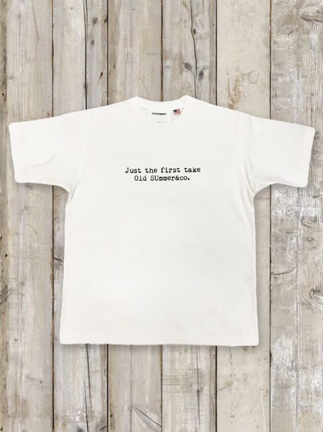 2025 年夏、オールドサマーは新たな一歩を踏み出します。 Old SUmmer&co.として新たにスタートを切ることになりました! その第一弾リリースとなる T シャツをご紹介します。 ■デザイン・カラー 胸に刻んだ言葉は “Just the first take ”私たち KUMSTYLE にとってこれは新たな チャレンジであり、スタートであり、大切な一歩です。 撮影的にいえば 1 カット目。その言葉を胸に我々はスタートします。 そして皆様も日々の生活の中で迷ったり、踏み出せない一歩があったら是非一緒に踏みだし てみませんか?オルサマファミリーとしてみんなで前進しましょう! 行けばわかるさ!迷わず行けよ!アントニオ猪木先生も言っています(笑) “Just the first take”の言葉を胸にオルサマファミリーのチャレンジを応援する T シャツ です! カラーはホワイトとブラックの 2 色。デザインはシンプル目だけにどんなスタイリングにも対 応可能。カジュアルにもジャケットと合わせてちょいフォーマル的着こなしでも OK!! 迷ったあなたはハイ!!2 色買い(キナシタさん談(笑)) 背中にちょいお茶目な“オルサマ“のカタカナがいい感じの抜け感を演出。前からも後ろ姿で もアピールしちゃう良くできた 1 ピンです。 ■フォルム・サイズ サイズの着こなしはジャストで着て頂きたいのですが、生地が硬めなため&洗うと少々縮む ために少し大き目をお勧めします。 ■ファブリック ボディはこだわりの USA コットン 8.1oz 。ちょっと厚手ですがしっかり汗を吸収してくれま す。 生地感も少し硬めですが、これがなかなかヘビーデューティーさを醸し出してます。 かつての渋カジ魂に火をつける新しいオルサマの定番 T シャツボディ候補です!