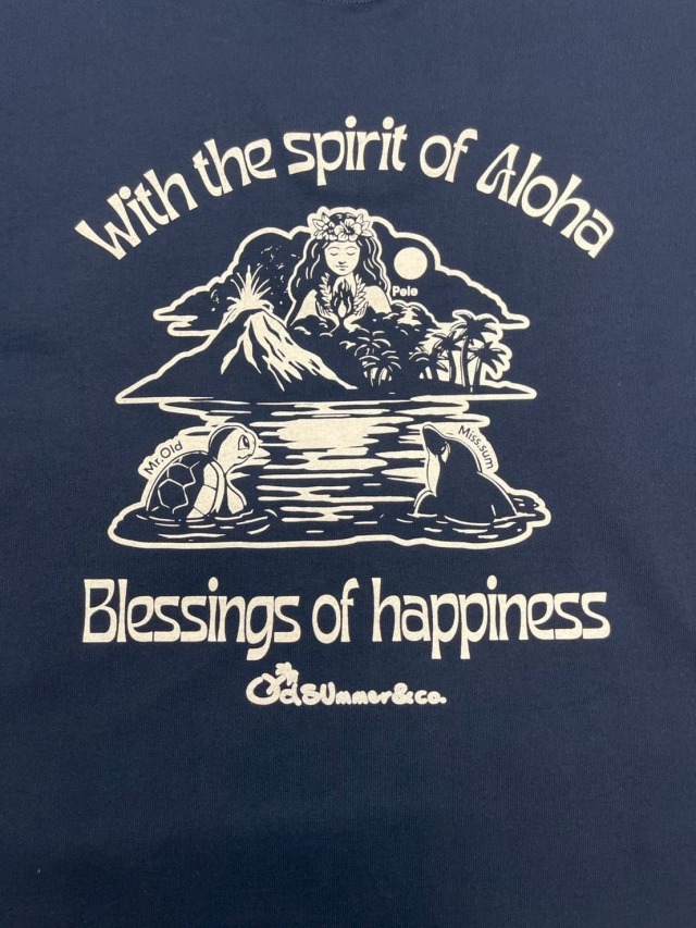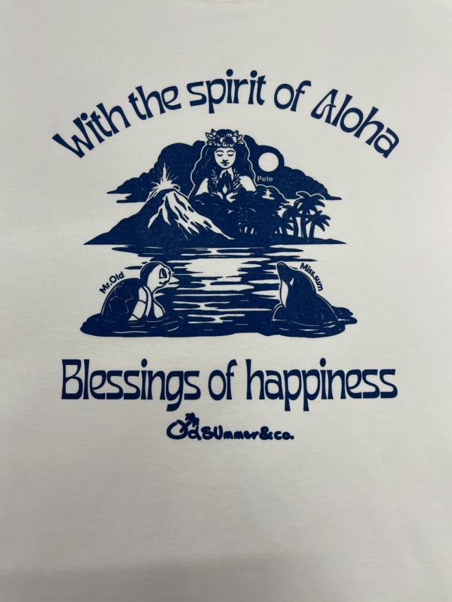 ハワイの女神ペレとオルくんサマーちゃんTシャツ With a spirit of Aloha, Blessings of happiness Tee この一枚には、ハワイの大地に宿るエネルギーと、オールドサマーならではの遊び心を込めました。 ■デザイン・カラー 胸元に描かれているのは、火山の女神ペレ、ウミガメの“オルくん”、そしてイルカの“サマーちゃん”。 彼らは、オールドサマーファミリーの未来に訪れる幸運や喜びについて、楽しそうに語り合っています。 その姿はまるで、ハワイの海と火山がもたらす自然の力が、やさしくファミリーを見守っているかのよう。 イラストに添えられたメッセージは、 「With a spirit of Aloha, Blessings of happiness」。 アロハの心とともに、幸せの祝福をファミリーに贈りたい、そんな想いをシンプルな言葉で表現しました。 定番でデニムやチノパンはもちろんどんなスタイルにも合わせやすいホワイトとネイビーの2色展開です。 このTシャツを身にまとうことで、 お守りのようにポジティブなエネルギーを感じられ、 日常の中に小さな奇跡やハッピーを引き寄せてくれるはず。 ハワイの神話とキャラクターの世界観、確かな素材感、そして着やすさが融合した特別な一枚。 着ることで幸運を呼び込み、毎日をもっと楽しく、もっと自分らしく。 そんな願いを込めてお届けします。
