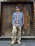 チェックシャツをインナーに、ゆったりしたチノパンと合わせる。