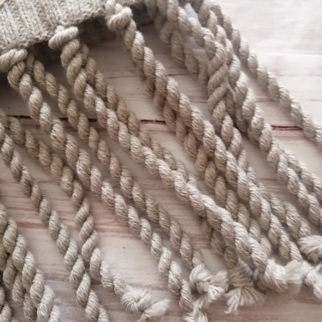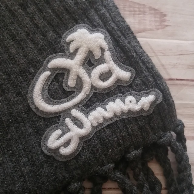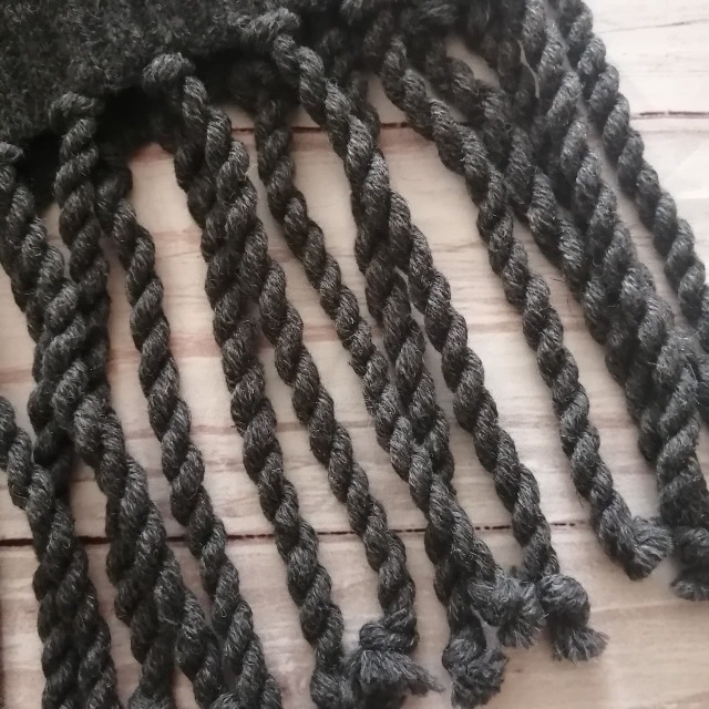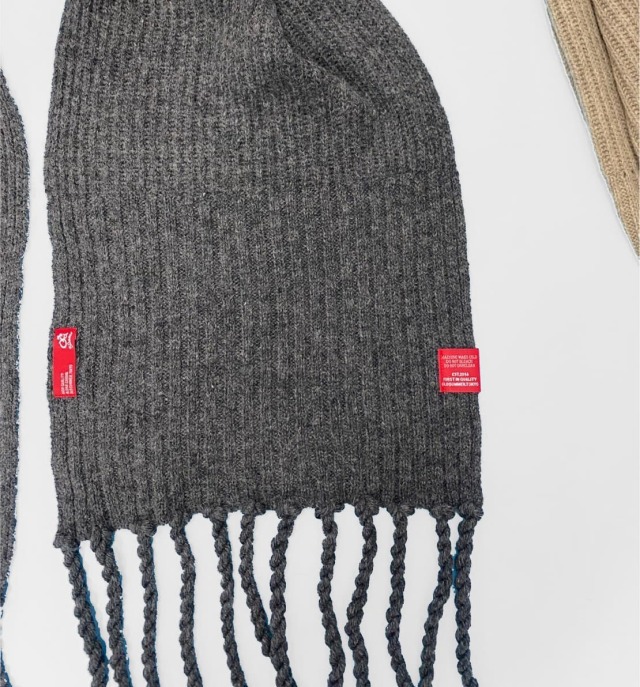 「太フリンジ」が可愛くて特徴的。2つのリブ編みを合わせた、アクセントの効いた大判ニット地。